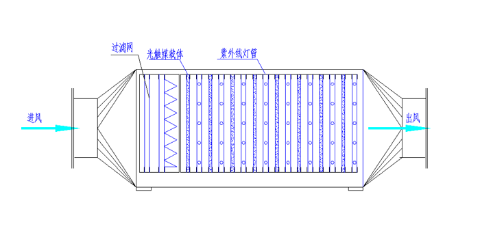利用特制的高能高臭氧UV紫外線光束照射廢氣,裂解工業(yè)廢氣如:氨、三甲胺、硫化氫、甲硫氫、甲硫醇、甲硫醚、乙酸丁酯、乙酸乙酯、二甲二硫、二硫化碳和苯乙烯,硫化物H2S、VOC類,苯、甲苯、二甲苯的分子鏈結(jié)構(gòu),使有機或無機高分子惡臭化合物分子鏈,在高能紫外線光束照射下,降解轉(zhuǎn)變成低分子化合物,如CO2、H2O等。利用高能高臭氧UV紫外線光束分解空氣中的氧分子產(chǎn)生游離氧,即活性氧,因游離氧所攜正負電子不平衡所以需與氧分子結(jié)合,進而產(chǎn)生臭氧。