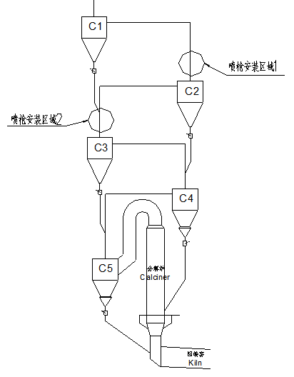 熱生料噴注法是將已分解的生料喂入預(yù)熱器系統(tǒng)適當(dāng)位置。已分解的生料中含有大量的CaO,CaO可以與SO2反應(yīng)生成硫酸鈣。噴射的位置同樣位于C2/C3的煙氣出口管道。