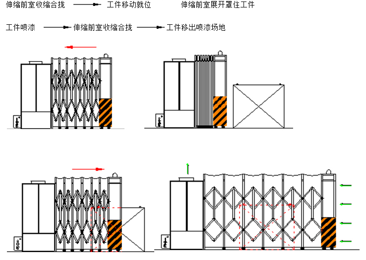 特點:伸縮移動噴漆前室和無泵水幕噴漆室結(jié)合使用,是解決重型工件噴漆時移動難的問題,而活動噴漆前室就克服這個問題。工作時將活動前室收縮,用天車將重型工件吊運到噴漆場地,再將活動前室展開,罩住工件,即可工作。噴漆后再將前室收縮,用天車將工件吊離,不影響天車的工作。